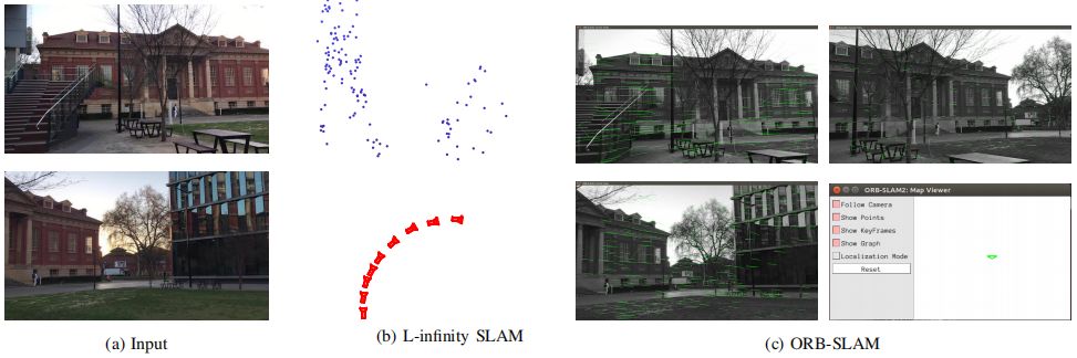 我们提出了一个不同的SLAM的优化核心:我们进行旋转平均而不是光束平差,逐步优化相机的方向。在给定方向的情况下,我们通过凸函数公式来估计相机的位置和3D点,它可以高效且全局地进行求解。我们的方式不仅避免了在关键帧上繁琐的估计计算,还有维护位置和3D地图的需要(它能简化我们的SLAM系统),它也更能够处理慢速运动和纯旋转。