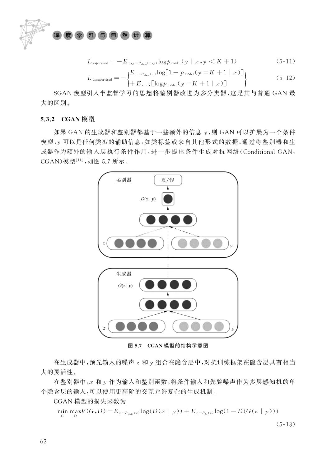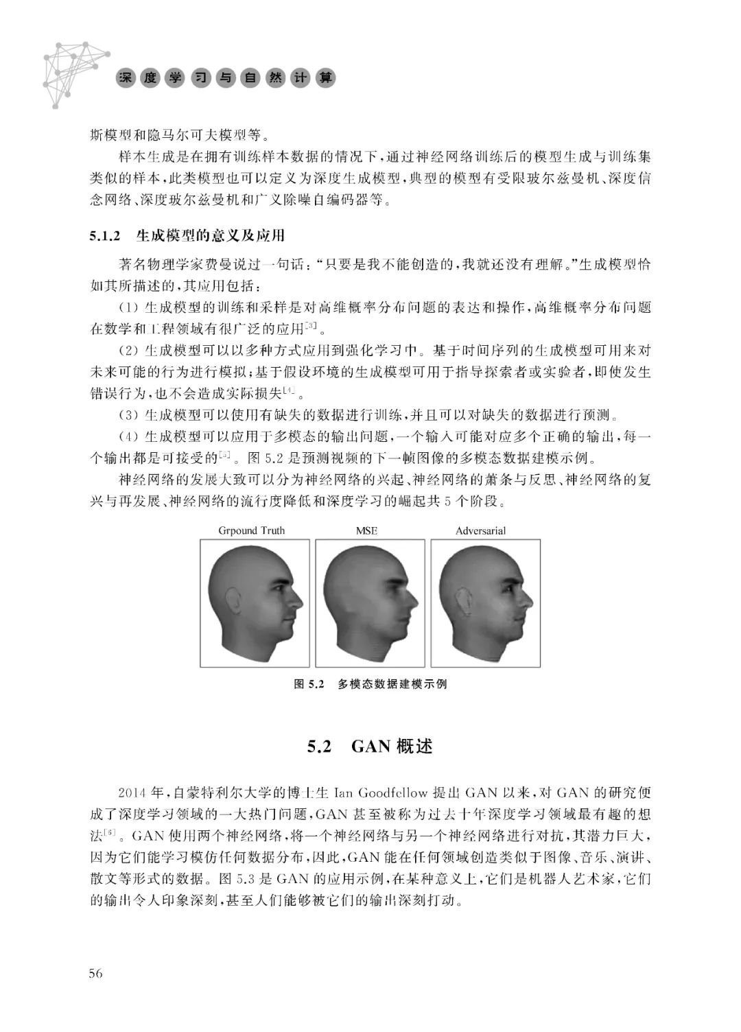 著名物理学家费曼说过一句话:“只要是我不能创造的,我就还没有理解。”生成模型恰 如其所描述的,其应用包括: (1)生成模型的训练和采样是对高维概率分布问题的表达和操作,高维概率分布问题 在数学和工程领域有很广泛的应用[3]。(2)生成模型可以以多种方式应用到强化学习中。基于时间序列的生成模型可用来对 未来可能的行为进行模拟;基于假设环境的生成模型可用于指导探索者或实验者,即使发生 错误行为,也不会造成实际损失[4]。(3)生成模型可以使用有缺失的数据进行训练,并且可以对缺失的数据进行预测。(4)生成模型可以应用于多模态的输出问题,一个输入可能对应多个正确的输出,每一 个输出都是可接受的[5]。图5.2是预测视频的下一帧图像的多模态数据建模示例。神经网络的发展大致可以分为神经网络的兴起、神经网络的萧条与反思、神经网络的复 兴与再发展、神经网络的流行度降低和深度学习的崛起共5个阶段。