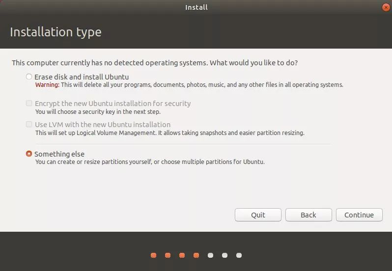 然后选择点击“Something else”,这样我们就可以对硬盘进行分区,并预留出 Ubuntu 和 Archlinux 的分区以及它们的交换分区的空间。