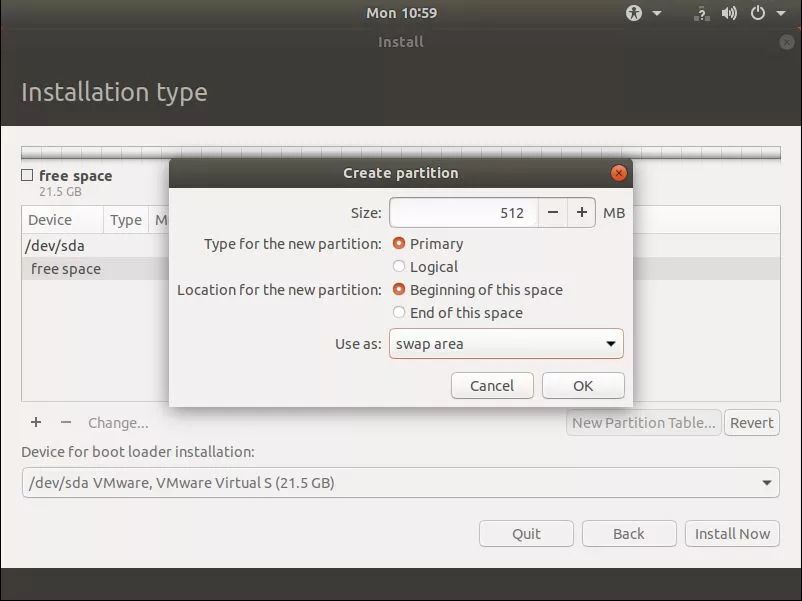 创建一个交换分区。最好是内存的一半大小。在我的例子中,我有 1 GB 的内存,因此创建一个 512 MB 的交换空间。