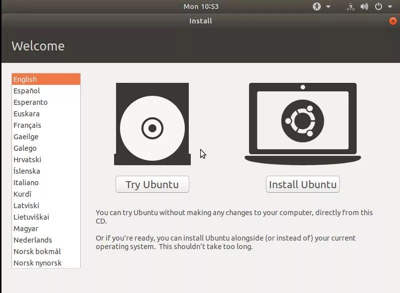 在成功启动后,您将看到如上图显示,要求您尝试 Ubuntu 或安装 Ubuntu,选择安装 Ubuntu。