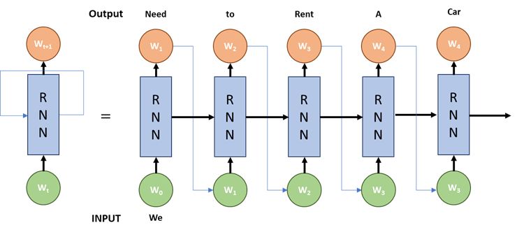 在递归神经网络的每次迭代中,模型都会将之前遇到的单词存储在内存中,并计算下一个单词的概率。例如,如果模型生成了文本 We need to rent a __,那么它现在就必须计算出这句子中的下一个单词。对于词典的每个单词,模型根据它所看到的前一个单词来分配概率。在我们的这个示例中,house 或 car 这两个词的概率要比 river 或 dinner 这样的单词高得多。然后选择概率最高的单词并将其存储在内存中,然后模型继续进行下一次迭代。
