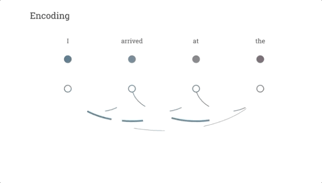 在上面的例子中,编码器处理输入句子并为其生成表示。解码器使用这种表示逐词创建输出句子。每个单词的出事表示 / 嵌入由未填充的圆圈表示。然后,模型使用自注意聚合来自所有其他单词的信息,以生成每个单词的新表示,由填充的圆圈表示,并由整个上下文通知。然后对所有单词并行重复该步骤多次,接连生成新的表示。类似地,解码器每次从左到右生成一个单词。它不仅关注先前创建的其他单词,还关注编码器开发的最终表示。