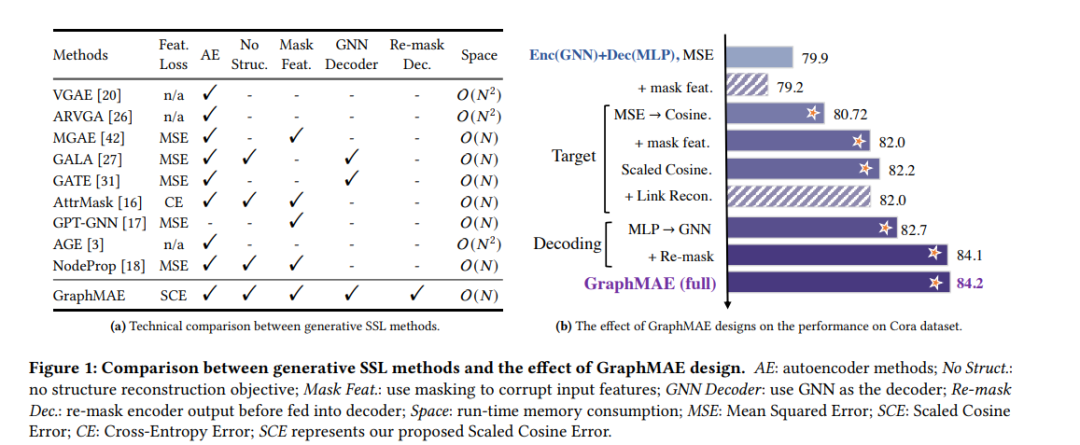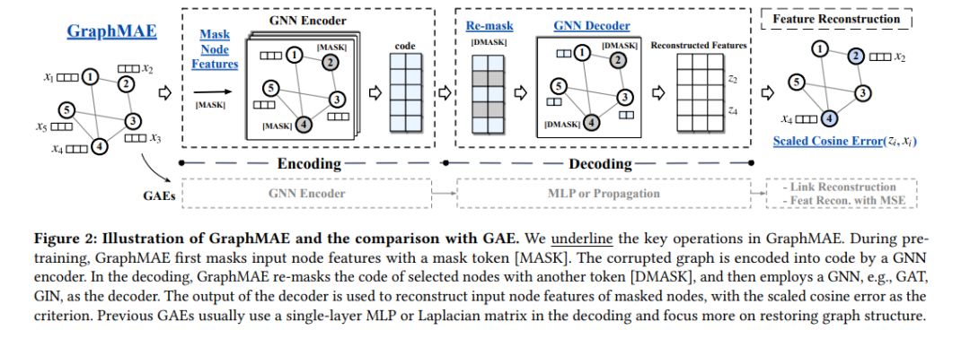 自监督学习(Self-supervised learning, SSL)是近年来的研究热点。特别是,生成式SSL已经在自然语言处理和其他领域取得了成功,例如BERT和GPT的广泛采用。尽管如此,对比学习(严重依赖结构化数据增强和复杂的训练策略)一直是图SSL的主要方法,而在图上生成SSL的进展,特别是图自编码器(GAEs),迄今尚未达到其他领域所承诺的潜力。在本文中,我们识别并研究了对GAEs发展产生负面影响的问题,包括它们的重建目标、训练鲁棒性和误差度量。我们提出了一个掩码图自编码器GraphMAE,它缓解了生成式自监督图学习的这些问题。而不是重建结构,我们建议集中在特征重建与掩蔽策略和缩放余弦误差,有利于GraphMAE的鲁棒训练。我们在21个公共数据集上进行了广泛的实验,用于三种不同的图学习任务。结果表明,GraphMAE—一个经过我们精心设计的简单图自编码器—能够始终如一地生成优于对比基线和生成基线的性能。本研究提供了对图自动编码器的理解,并展示了在图上生成式自监督学习的潜力。