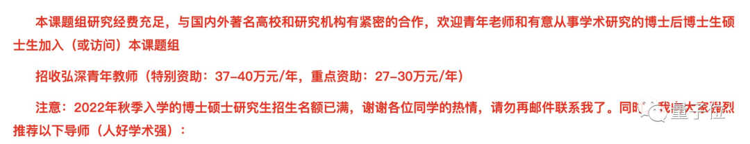 他名下2022年秋季入学的博硕士研究生招生名额已满(博士生1名、硕士生3名),所以他在主页上给大家推荐了其他导师。