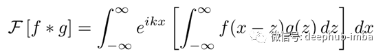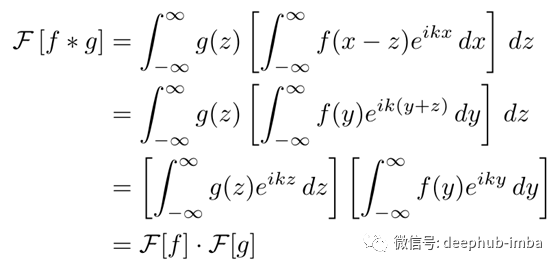 换句话说,位置空间的卷积等价于频率空间的直接乘法。这个想法是相当不直观的,但证明卷积定理是惊人的容易对于连续的情况。首先把方程的左边写出来。