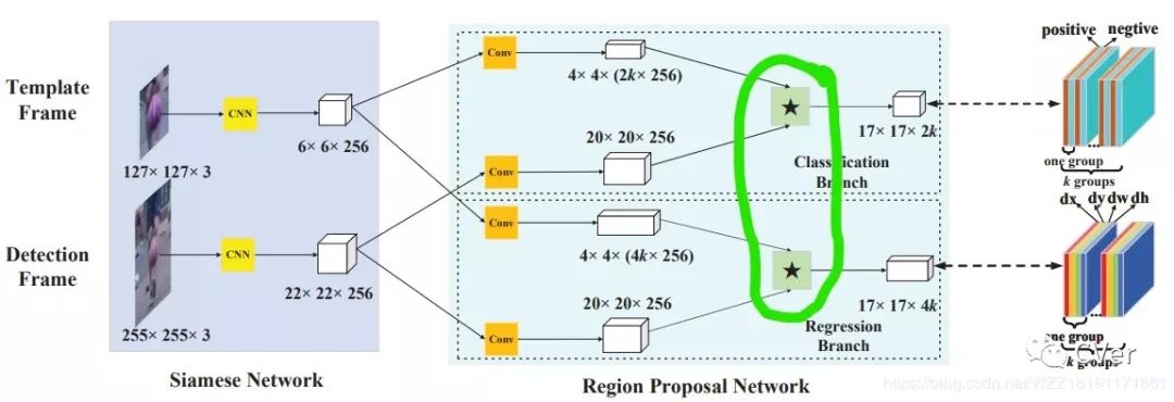 这个框图与众不同的是它是一个端到端的跟踪网络,而且速度很快!这篇论文使得基于孪生网络的跟踪器火了起来,让研究者们看到了新的希望。