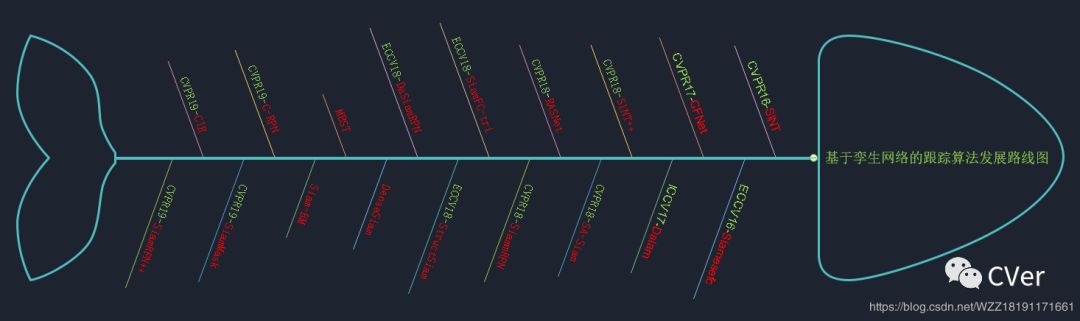 首先来看一张比较丑陋的发展路线图,这张图中我绘制了整个基于孪生网络的跟踪算法的发展路线图,按照从右向左的顺序展现了当前比较好的基于孪生网络的跟踪算法,绿色表示的是对应的年份,红色对应的是跟踪算法的名称。短短的两年时间,这条分支上已经出现了众多性能优异的跟踪算法,尤其是CVPR2019发表的SiamRPN++和CIR算法更加凸显了孪生网络的性能,使得基于孪生网络的跟踪算法的性能在真正意义上超越了基于相关滤波类的跟踪算法。为了大家更好的熟悉当前跟踪领域的方向,下图展示了跟踪大牛-王强的个人总结。