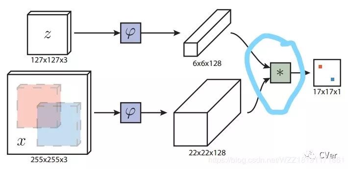 这篇文章整体思路和Siamese-fc算法的思路基本相同,不同之处在于将相关滤波(CF)整合为一个网络层,并将其嵌入到基于孪生网络的框架中,如图中蓝色的区域所示。