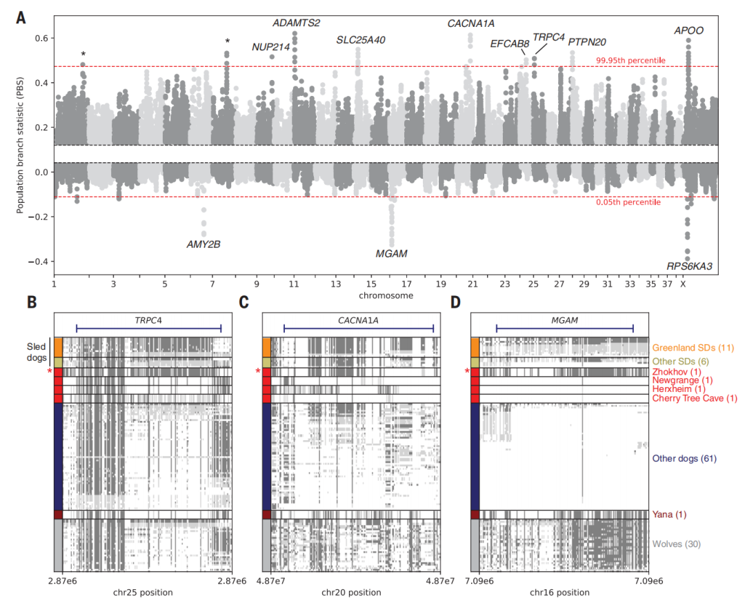 除此之外,此项研究还发现了雪橇犬与其他狗之间的差异,即雪橇犬不像其他狗那样,对富含糖和淀粉的食物有相同的适应性基因,反而对高脂肪饮食(北极地区饮食更偏向高脂肪)更为适应,其机制与北极熊和爱斯基摩人十分相似。