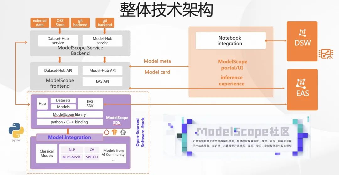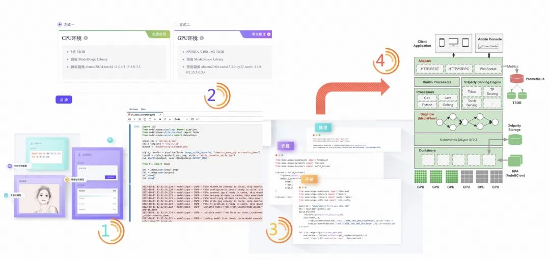 与此同时,魔搭社区将模型、数据和算法有机结合起来,来降低模型体验的门槛,让模型能够被快速的被使用,并且能快速的被微调,最终让适合具体业务场景的微调后的模型,能快速云端部署。