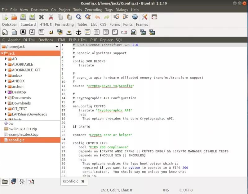 就文本编辑器而论,选择 Bluefish[6] 一般不会有错。 Bluefish 可以从大部分软件库中安装,它支持项目管理、远程文件多线程操作、搜索和替换、递归打开文件、侧边栏、集成 make/lint/weblint/xmllint、无限制撤销/重做、在线拼写检查、自动恢复、全屏编辑、语法高亮(如下图)、多种语言等等。