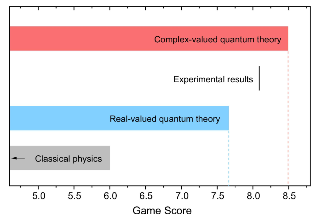 在理论框架下,实数形式的界限为 7.66,而实验测试结果为 8.09,超过判据 43 个标准差。实验结论支持量子物理需要使用复数。