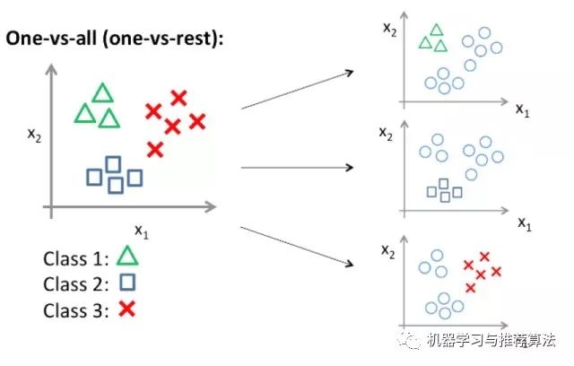 其中,一种简单的想法是one vs all。主要思路为:将多分类任务转换为多个二分类任务,只不过我们需要训练若干个分类器(有多少类别对应多少分类器)。对于每个二分类模型,将其中一个类别当做正例,其余所有其他的类别样例当做负例(图片来自Andrew NG课件)。这种方法存在一个问题,就是对于一个任务我们需要训练若干次二分类模型,时间复杂度高;同时我们将一个多分类任务分成多个独立的子任务来进行建模可能会有失精度。