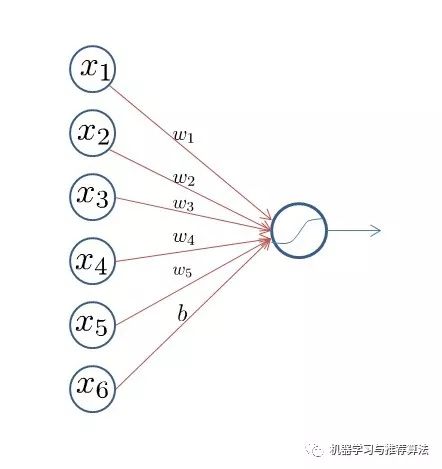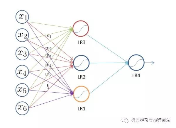 对于LR模型来说,我们可以把它看做拥有一个隐层的神经网络。注意此处的 为标量,代表的是样本的某一维度特征。我们可以把每个样本的维度当做输入层的节点(共有6个特征),要学习的权重我们用