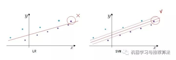 于是人们想到一个方法,既然我需要找一个最优超平面(或者直线),那么我先看一下观测数据中距离最近的点所构成的直线(支持向量),然后我把它们两条直线的距离取中间位置,然后画一条线不就得了,这就是SVM的朴素思想。正因为如此,它才更具有泛化能力,如下图所示,如果是LR模型的话很可能将遇到的新数据(图中圆圈内的紫色数据点)分为青色,而对于SVM来说,由于找到了更好的超平面,所以能够正确的将它分为紫色。