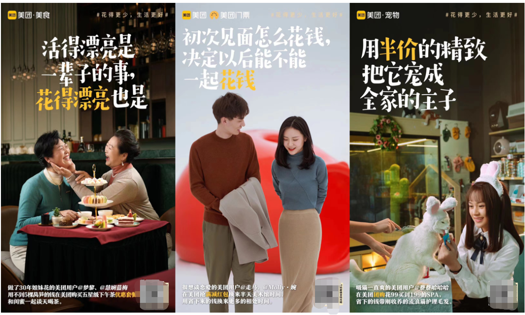 值得注意的是:当代消费者尤其是年轻消费者,已经不再迷信“权威”的背书,他们反而更容易信任和他们处于同一处境的“素人”。美团曾经推出过一组主打“省钱”主题的海报,海报选取了一组来自平台的用户,分享他们的省钱心得。