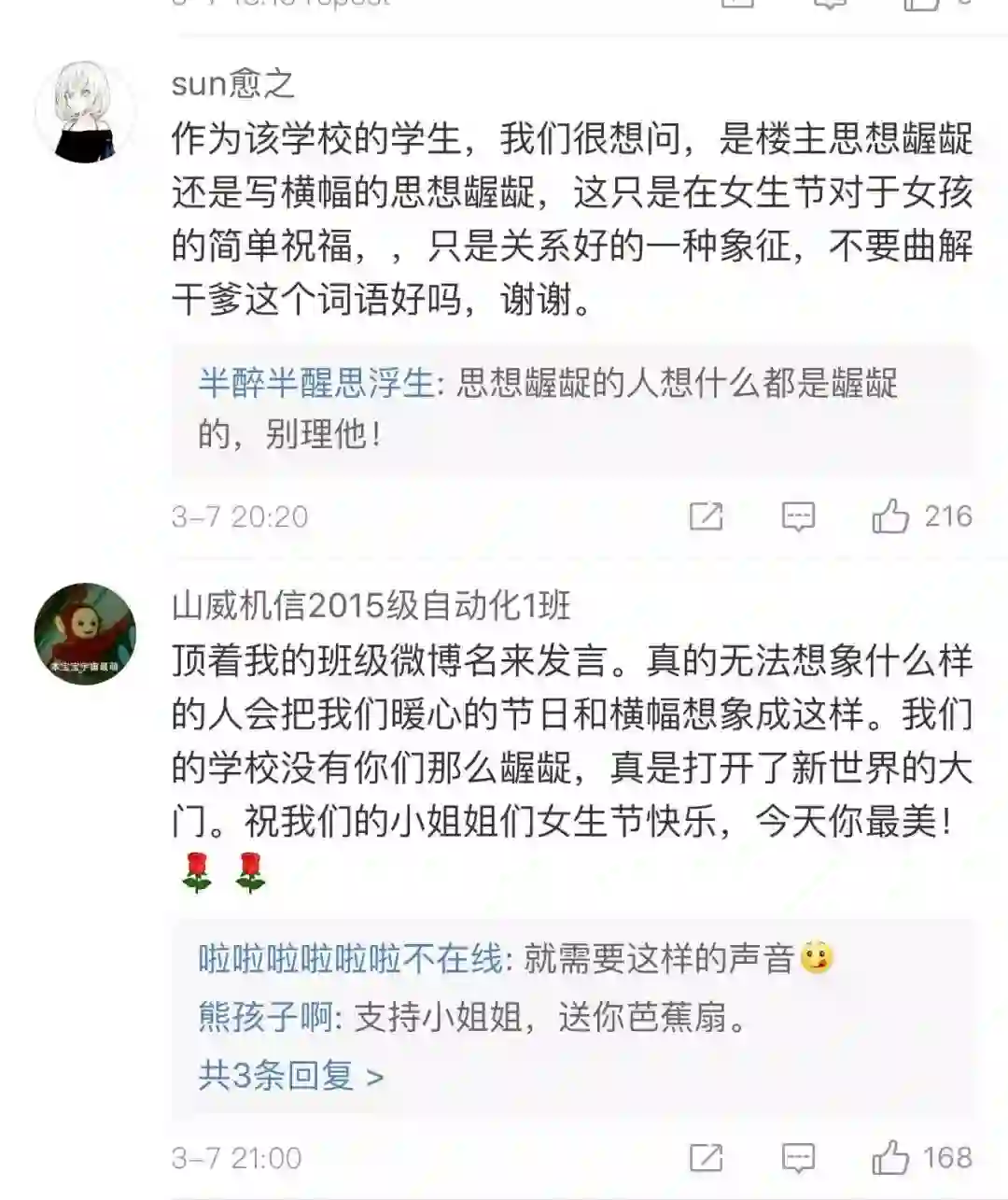 “女生节”的发源地山东大学,挂出了这样一条横幅,被该校的学生指出存在性骚扰的嫌疑,并被一名经常在相关领域发言的博主转载。该博主随后收到上千山大学生的质疑、辱骂、人身攻击,做出性骚扰“指控”的三名学生也被威胁会遭到人肉搜索。