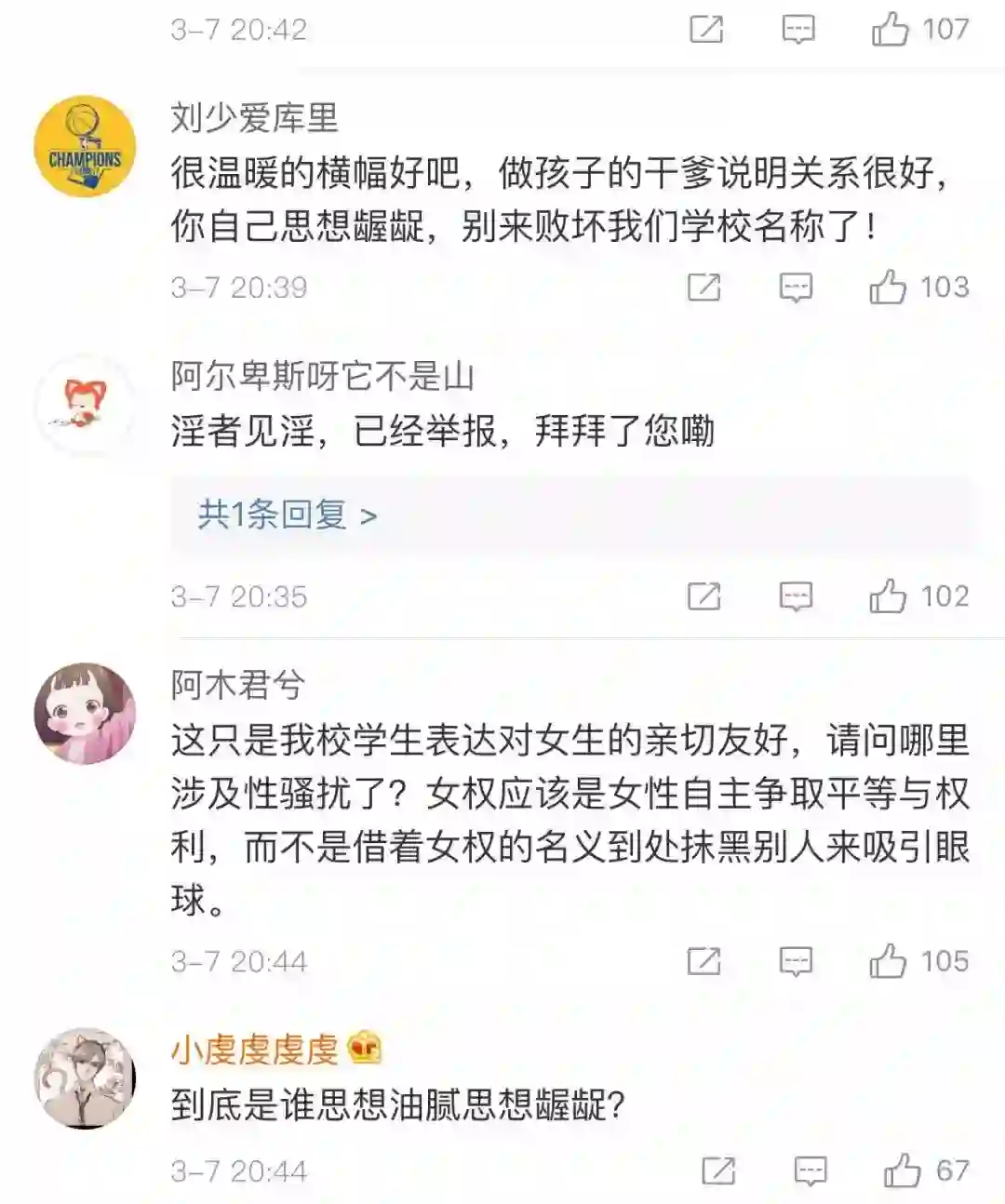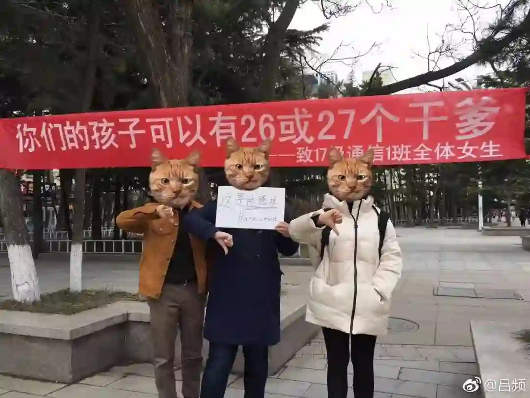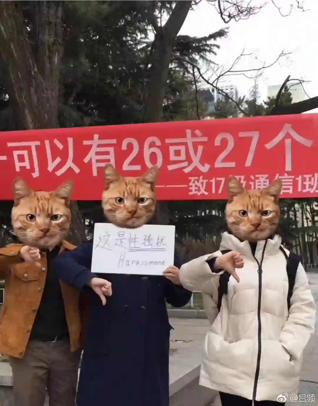 也正因此,选择了理性的人就显得格外可敬。就像这次事件里,那三名举着“这是性骚扰”,站在横幅前大拇指朝下清晰地表达观点的同学。