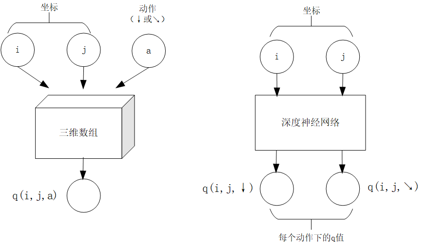 对于数字三角形问题,左图为使用三维数组实现 ,右图为使用深度神经网络近似实现