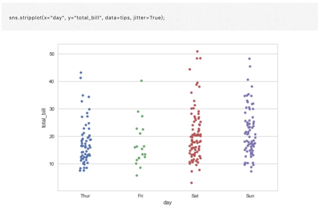 在条纹图中,散点图通常将重叠。这使得很难看到数据的完整分布。一个简单的解决方案是使用一些随机的 “抖动” 调整位置(仅沿着分类轴)