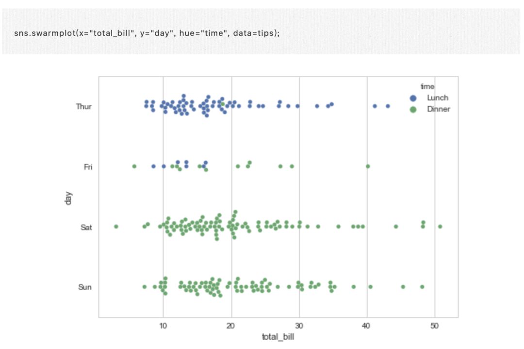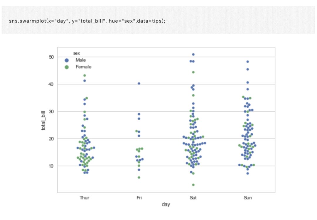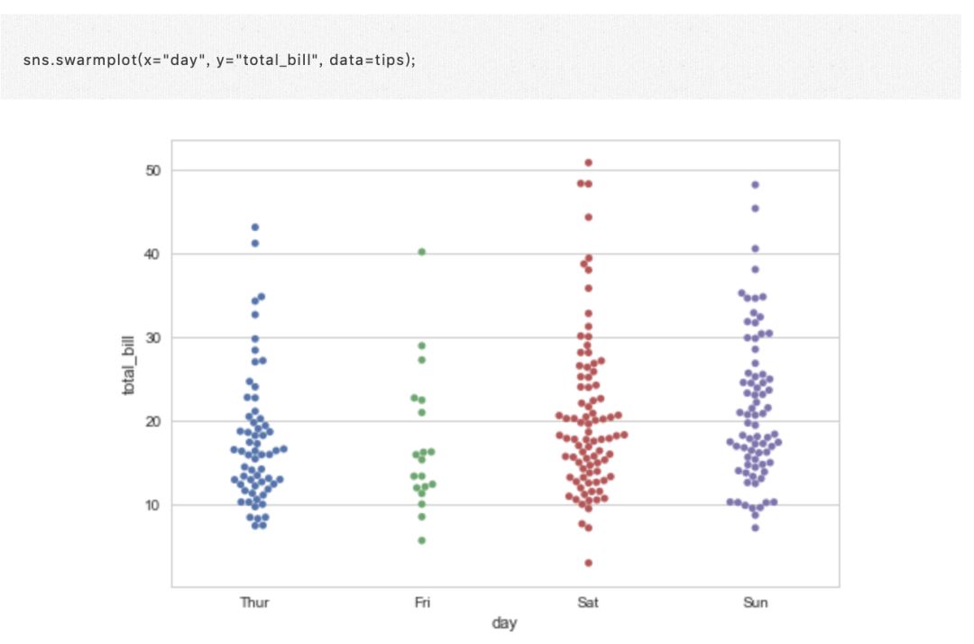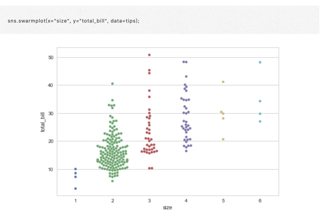 不同的方法是使用函数 swarmplot(),它使用避免重叠点的算法将分类轴上的每个散点图点定位: