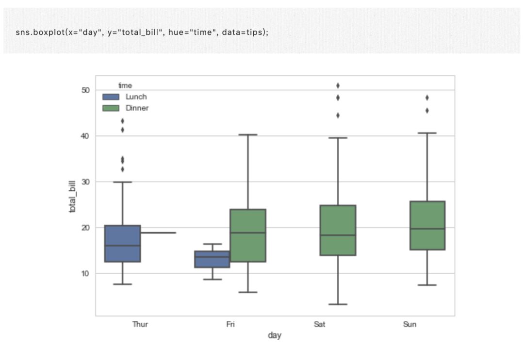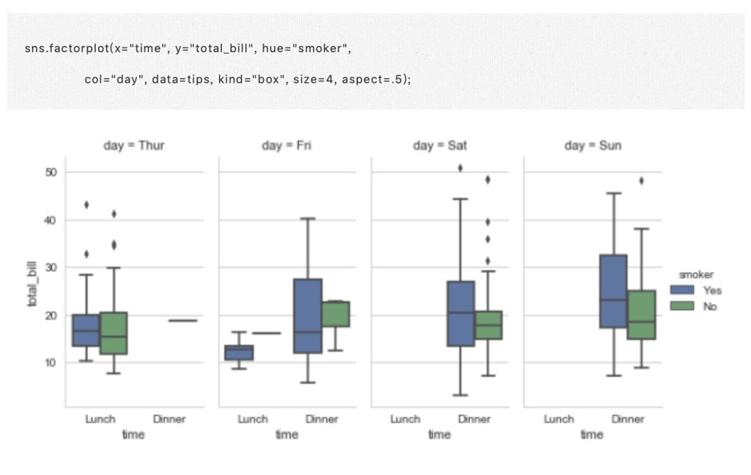 重要的是要注意,你也可以直接使用 boxplot() 和 FacetGrid 来制作这个图。但是,必须特别注意确保分类变量的顺序在每个方面实施,方法是使用具有 Categorical 数据类型的数据或通过命令和 hue_order。