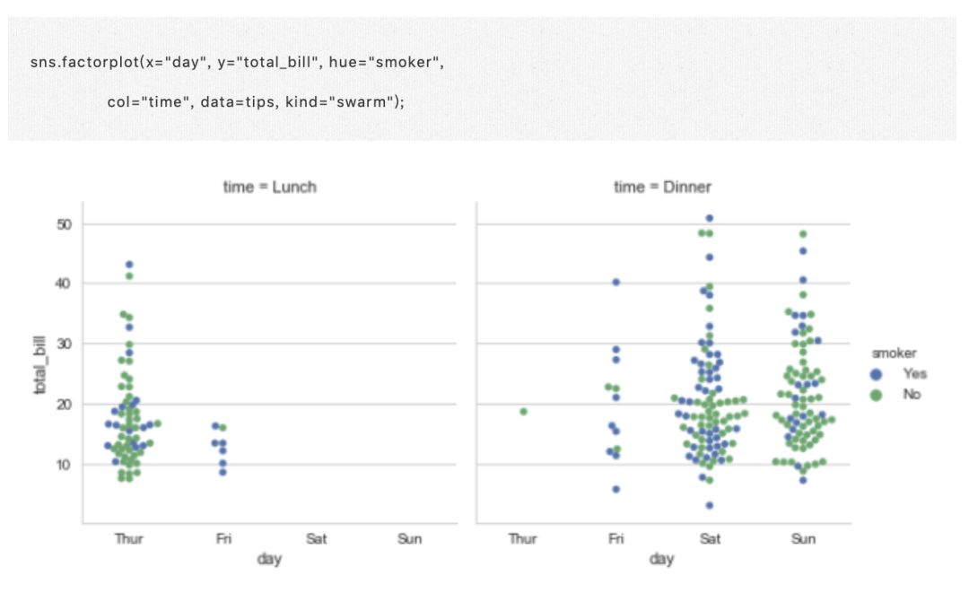 这与之前的 regplot() 和 lmplot() 的关系非常相似(未禾备注:在 seaborn 的构架中很容易分成这样两类用途相似,使用有所差异的替代方案函数)。在 Seaborn 中,相对低级别和相对高级别的方法用于定制分类数据的绘制图,上面列出的函数都是低级别的,他们绘制在特定的 matplotlib 轴上。还有更高级别的 factorplot()(未禾备注:这是一个非常简明的快速绘制函数,具体用法会在最后有详细介绍),它将这些功能与 FacetGrid 结合,以便在面板的网格中应用分类图像。