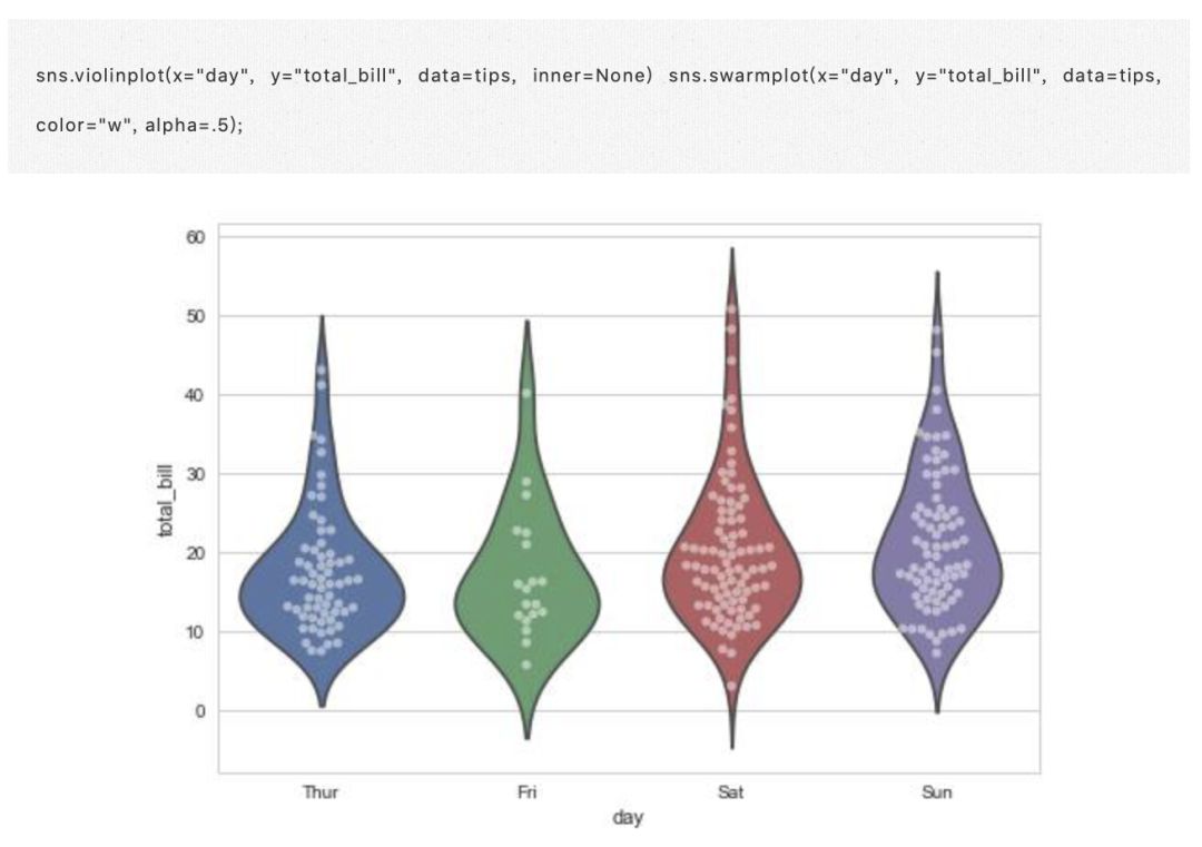 将 swarmplot() 或者 swarmplot() 与 violinplot() 或 boxplot() 结合使用可以显示每个观察结果以及分布的摘要: