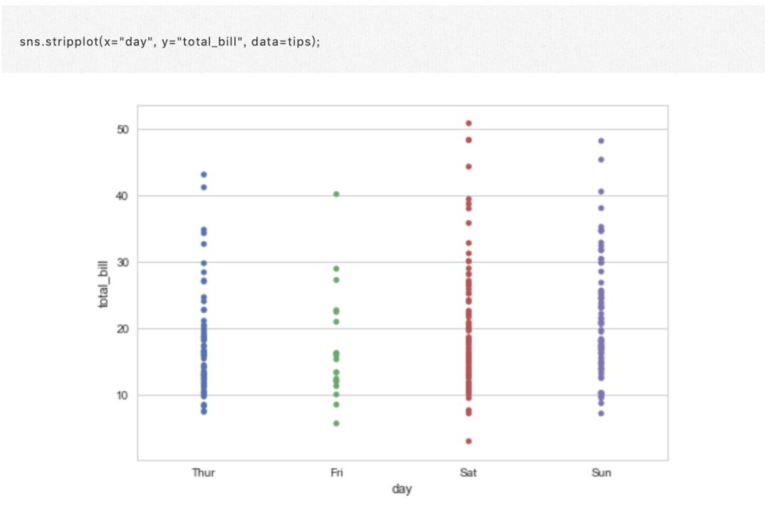 显示分类变量级别中某些定量变量的值的一种简单方法使用 stripplot(),它会将分散图概括为其中一个变量是分类的: