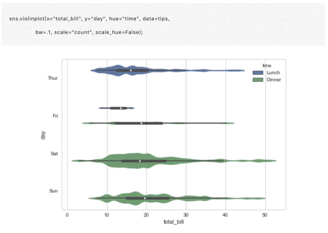 这种方法使用核密度估计来更好地描述值的分布。此外,小提琴内还显示了箱体四分位数和晶须值。由于小提琴使用 KDE,还有一些其他可以调整的参数,相对于简单的 boxplot 增加了一些复杂性:
