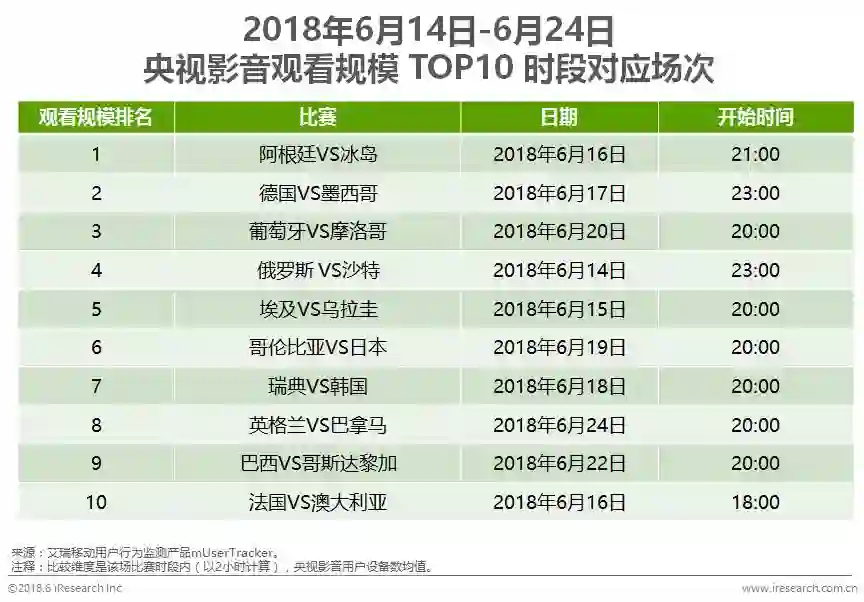 从分时段观看数据来看,以下为央视影音用户使用规模TOP10时段对应比赛场次,前三位分别是阿根廷VS冰岛、德国VS墨西哥和葡萄牙VS摩洛哥。观看规模与直播时间具有很强的相关性,下列十场比赛中有6场开始于20:00的晚间黄金时段。