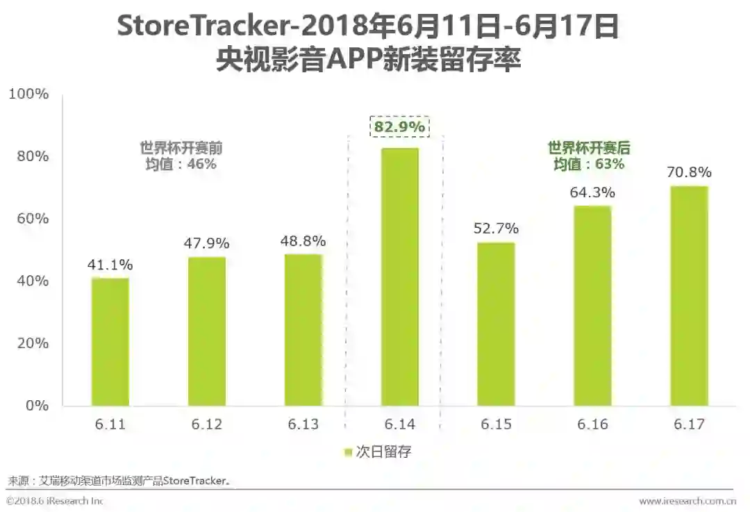 世界杯不仅为视频媒体带来显著流量增长,也进一步提高了app的用户粘性。以央视影音为例, 该app的新装留存率开赛后逐步走高,次日留存的赛后均值达到63%,较开赛前的46%收获17个百分点的提升。