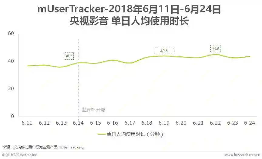 从人均指标来看,央视影音在世界杯期间单日人均访问5次,为开赛前的1.5倍,单日人均使用41.7分钟。在6月18日至6月24日这一周内,随着21场精彩的比赛接连上演,其平均单日人均访次进一步增长至5.5次,单日人均使用时长升至43.2分钟,峰值达到44.8分钟。随着接下来八强争霸大幕拉开,预计央视影音的访问和使用时长情况将进一步提升。