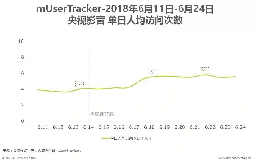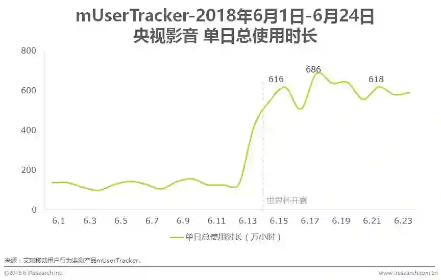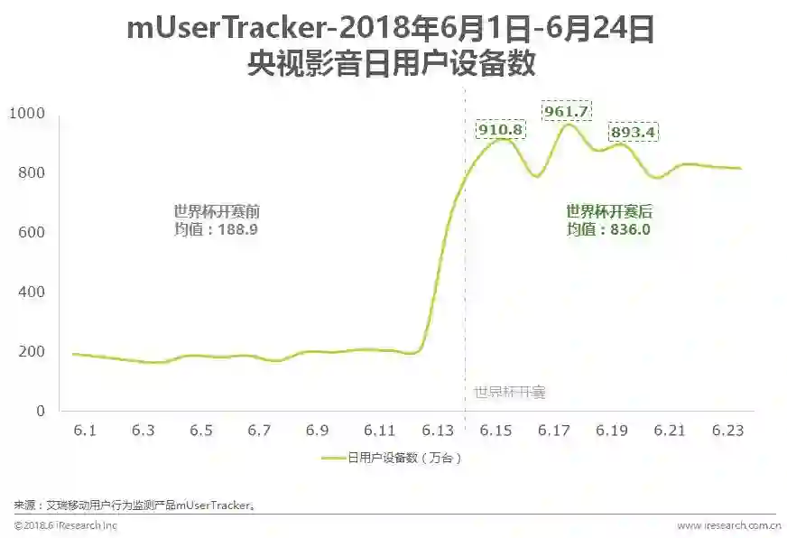 艾瑞数据显示,本次世界杯期间(数据截至6月24日,下同),央视影音日用户设备数增长势头迅猛,一经开赛便突破900万,随后6月18日的峰值更是逼近千万级别,日用户设备数均值增长至开赛前的4.4倍。
