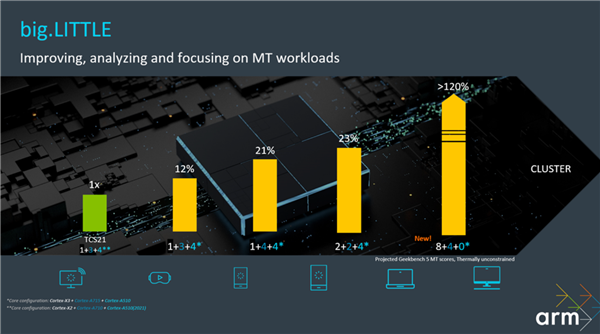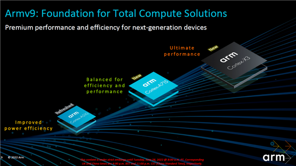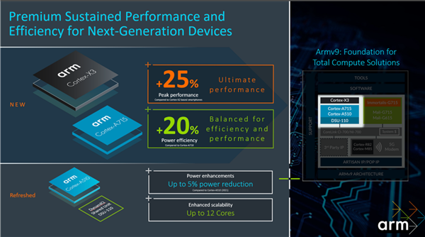 全新的 Cortex 核心将面向智能手机、平板及笔记本等平台,新的 DSU-110 大小核调度架构,支持除了目前主流的 1+3+4 之外,还有 1+4+4,2+2+4 及 8+4+0 等核心配置。按照目前消息,基于 Armv9 新架构设计的芯片预计最快在 2022 年底面世,已知高通骁龙 8 Gen 2 和联发科天玑旗舰芯片都会跟进采用该架构。