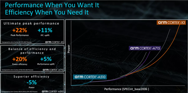 在这一代产品中,主要以性能的提升为目标。从 ARM 的官方数据可以看到,Cortex-X3 较上代提升了 22% 的性能表现;Cortex-A715 的性能比 Cortex-A710 提升了 5%,后者提升幅度不算高。