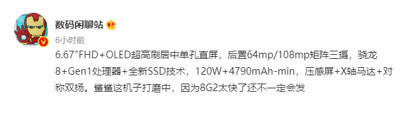 据 @数码闲聊站 今日爆料,新款的黑鲨游戏手机,将搭载骁龙 8+ 处理器,同时依旧保留自己 SSD 存储的技术特色。配置方面,该机正面预计会配备一块 6.67 英寸 FHD+ 的 OLED 单挖孔直屏,配备高刷新率,后置配备 6400 万像素或者 1 亿像素的主摄,内置 4790mAh 电池,支持 120W 快充。