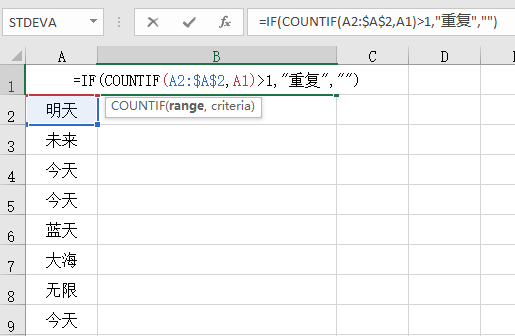 打开文档,,在B2单元格里输入公式“=IF(COUNTIF(A$2:$A3,A2)>1,"重复","")”(不含引号);
