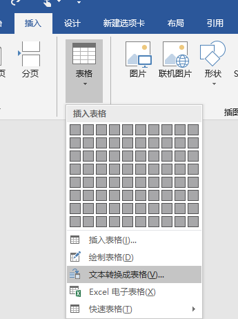 单击“插入”选项卡,单击“表格”下三角,选择“文本转换成表格”命令;