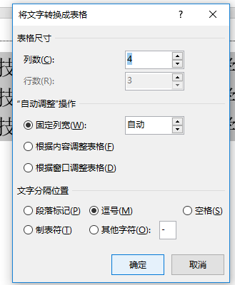 (3)在“自动调整”区根据需要选择,以设置表格列宽,“文字分隔位置”自动选中文本中使用的分隔符;