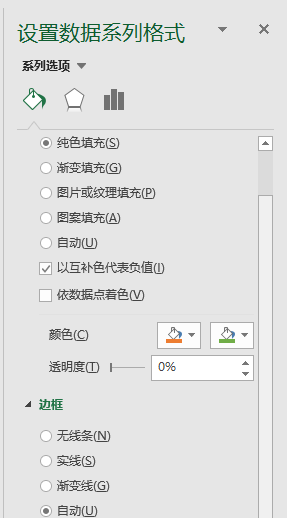 在图表区中选中数据列,然后右键设置“数据系列格式”-“填充”-“纯色填充”,并同时勾选”以互补色代表负值“,这时填充颜色选项中会出现两个备选颜色 ,分别选择合适的颜色表示正负值;