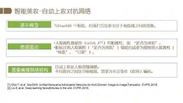 除数据库外,我们基于生成对抗网络对智能美妆模型做了一定的改进,这项工作目前还在进行中。具体包括两方面改进,第一基于大规模的人脸数据库辅助生成更高质量的美妆图像,目前是基于20万张的celebA人脸图像数据,选取包括是否为浓妆在内的总共三个人脸相关的属性,利用粗标注数据库完成智能美妆任务的辅助训练,从而使美妆属性的编辑更加细致。此外我们提出了新的网络结构。因为人脸编辑任务更多是人脸的微调,希望化完妆人的身份信息保持不变,我们的网络强调保持妆前妆后基本一致,更好的保持了图像的主体信息,更专注地编辑妆容条件。