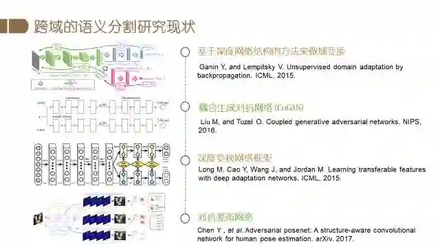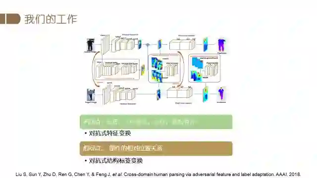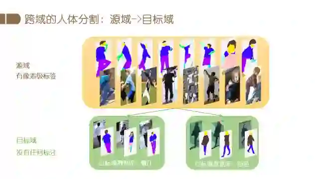 我们在人体解析方面的最新研究是有关跨域人体解析。因为比如想在多个城市建立图像分析系统,不可能在每个场景都标注很多数据,但是不同应用场景很多条件确实不一样。所以我们希望一旦建立了较好的模型,通过跨域的方法,该模型放在其他的特定场景中也可以使用。比如数据库标了很细致像素级的分类,这些库姿态多变,光照很多,数据量大。我们在实际应用的时候,比如想应用在室内餐厅,或者室外街道,这种情况下重新标注数据的代价是非常大的,而直接使用预先训好的模型效果又不是特别好。我们想研究的就是已经训练好的模型怎么使用。