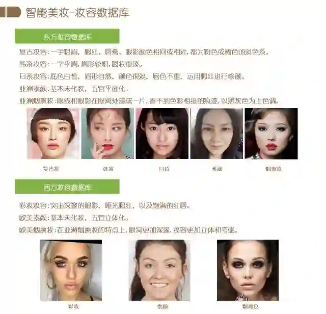 基于GAN,在人脸图像编辑方面,我们课题组主要进行了智能美妆方面的研究,属于图像到图像的生成领域的探索。首先我们构建了一个较大的美妆数据库,包括东方风格和西方风格的子数据库。东方风格包括复古妆、韩妆、日妆、素颜和烟熏妆,西方风格包括彩妆、素颜和烟熏妆。如图所示,每种妆容都有明确的定义。