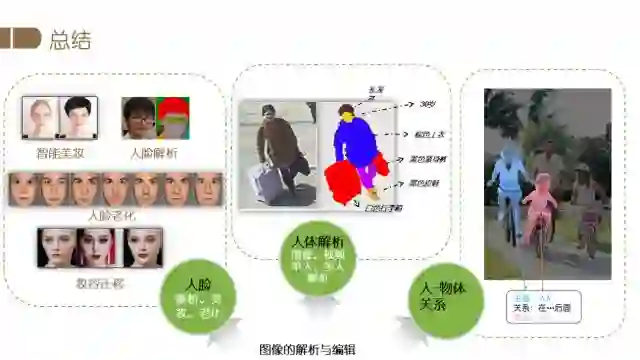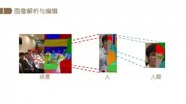图像理解与编辑涉及两方面的内容:首先获取图像中蕴含的丰富信息,然后按照需求对图像进行编辑。下图展示了图像理解问题的具体示例,对于某个场景,我们提取图像中的背景,如墙壁、桌椅等物体的信息,也可以解析图像中的重要元素——人,即对人的身体、服饰等部件进行分类、分割,进一步的还可对人脸进行解析,定位头发、五官等部位。图像理解与编辑具有广泛的应用场景,比如自动驾驶、娱乐产品、视频监控和增强现实等方面。