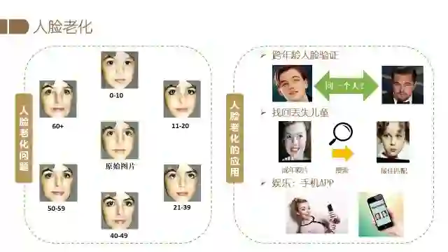 针对人脸编辑的另一个应用是人脸老化。下图中间是当前给定图片,通过人脸老化算法可以生成7个不同年龄段的人脸图像,即可以变年轻如10岁以下,也可以变老如一直到60岁以上。它的应用很广泛,比如可以辅助跨年龄段的人脸识别。身份证照片常常是很多年前拍摄的,长时间没有更新导致人证对比存在一定的难度,那么此时人脸老化的就可以辅助身份证的人证识别。另外比较有用的应用是寻找丢失的儿童,比如小孩走丢了,只有他很小的照片,人脸老化可以辅助生成长大后的样子,我们希望可以通过这样的算法,能够实现跨年龄的身份识别。此外人脸老化编辑还可以应用到互动娱乐应用中。