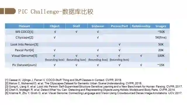 上图是PIC跟现有数据库的区别。Visual Genome是知名的关系数据库。其关系是定义在bounding-box上,PIC库的关系是定义在像素级别的分割之上。这种更细粒度的标注,使得定义的关系更为精确,也更符合实际应用的要求。