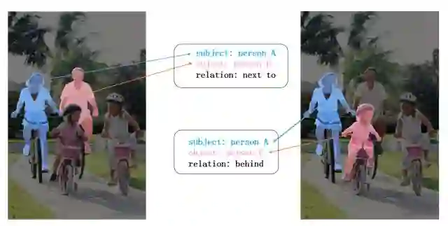 以人为中心的关系分割包括该人的和周围物体的动作关系、位置关系等。以左图为例,人A在人B的旁边。再比如右图,人A在人C的后面。关系分割的形式是<主语,关系,宾语> 形式的三元组。值得一提的是,关系都是建立在人和物体的场景像素级别分割之上的。