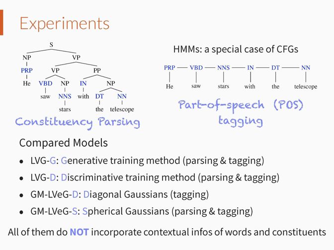其次,我们提出混合高斯隐向量文法模型(GM-LVeGs)。其中文法规则的权重密度函数定义为混合高斯分布,这样可以得到高效的推理和学习;我们在成分文法分析和词性标注任务上证明 GM-LVeGs 能够得到很好的结果。